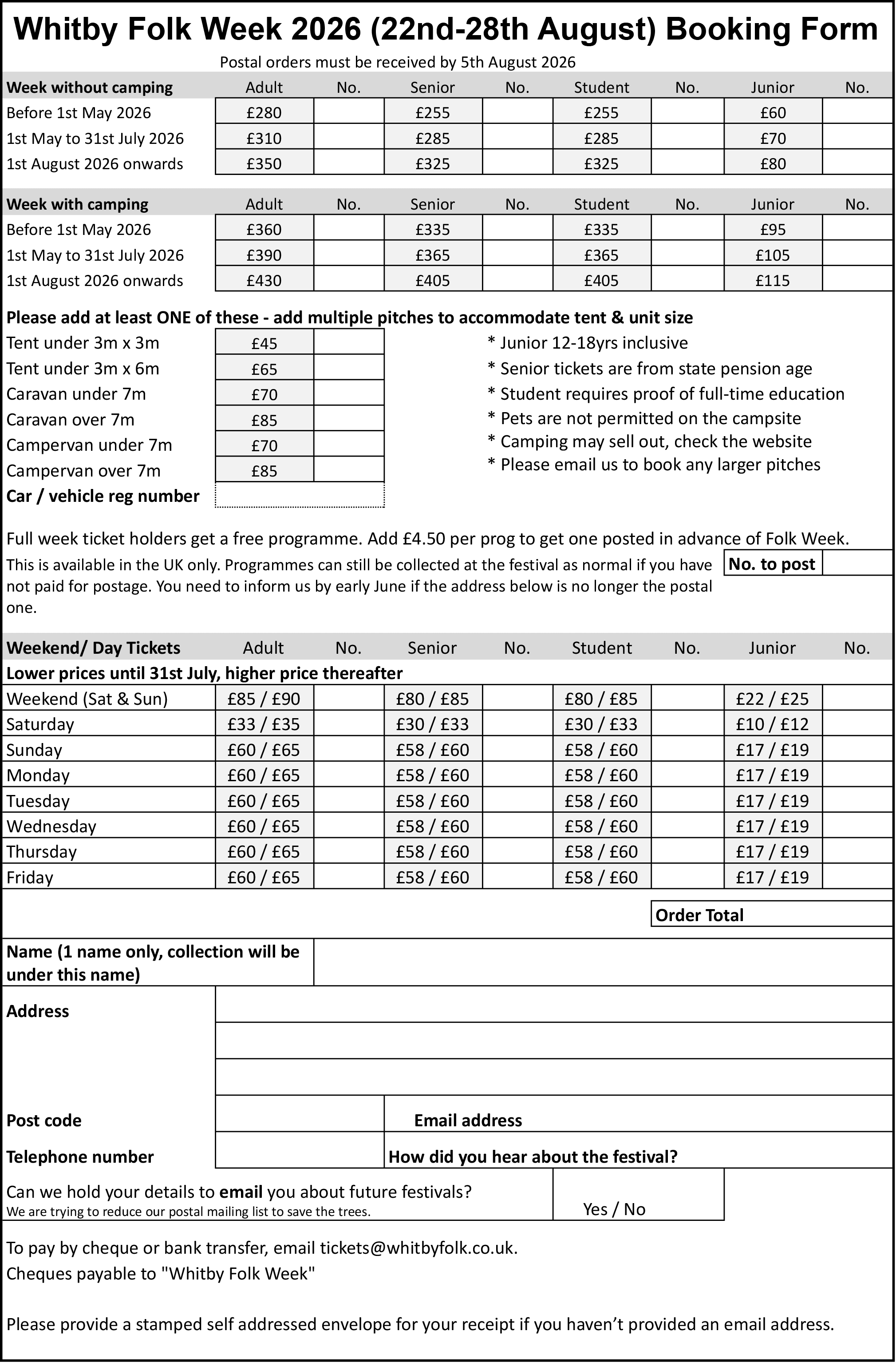 Please retain a copy of your online purchase receipt to exchange for your ticket when you arrive in Whitby – see here for further information. If you have any further queries please email us at tickets@whitbyfolk.co.uk